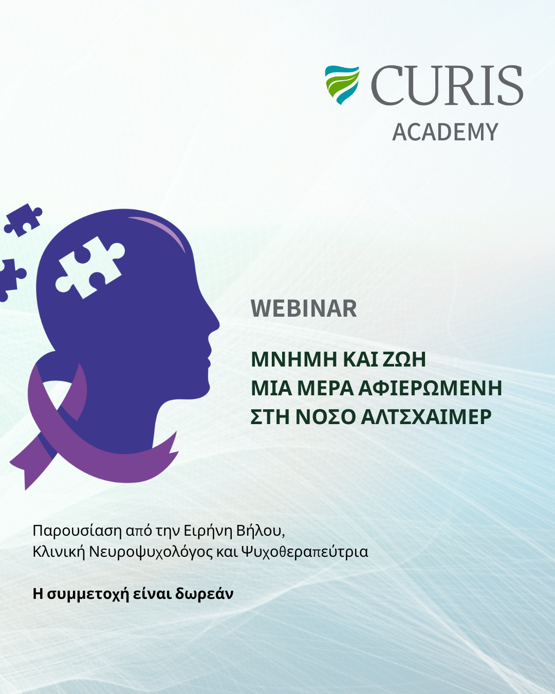 Ανακαλύψτε τη σημασία της μνήμης και τη ζωή με την Νόσο Αλτσχάιμερ σε ένα αφιερωμένο webinar, με αφορμή την Παγκόσμια Ημέρα Αλτσχάιμερ. Το Curis Network σας προσκαλεί σε αυτή την ξεχωριστή εκδήλωση με την παρουσίαση της Ειρήνης Βήλου, Κλινικής Νευροψυχολόγου και Ψυχοθεραπεύτριας, μιας εξαιρετικά έμπειρης επαγγελματία στον τομέα της ψυχικής υγείας.